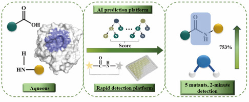 该研究报道了野生型 BPN’可在纯水溶液中直接催化羧酸与胺的缩合反应,无需使用有害且对环境不利的化学试剂。通过整合 AI 引导预测与 FRET 快速检测平台,加速了 BPN’的优化进程,在最少的实验周期内获得了催化活性显著提升的突变体。最终优化的突变体N155G/N218D/M222Q在催化活性上提高了753±14%,并扩展了底物范围,包括肽-非肽的结合,推动了肽合成的绿色可持续发展。